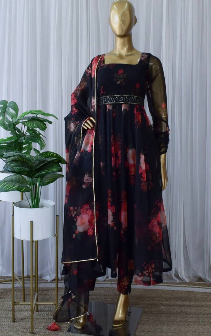 Black Organza Printed Anarkali Kurti With Pant and Dupatta Set