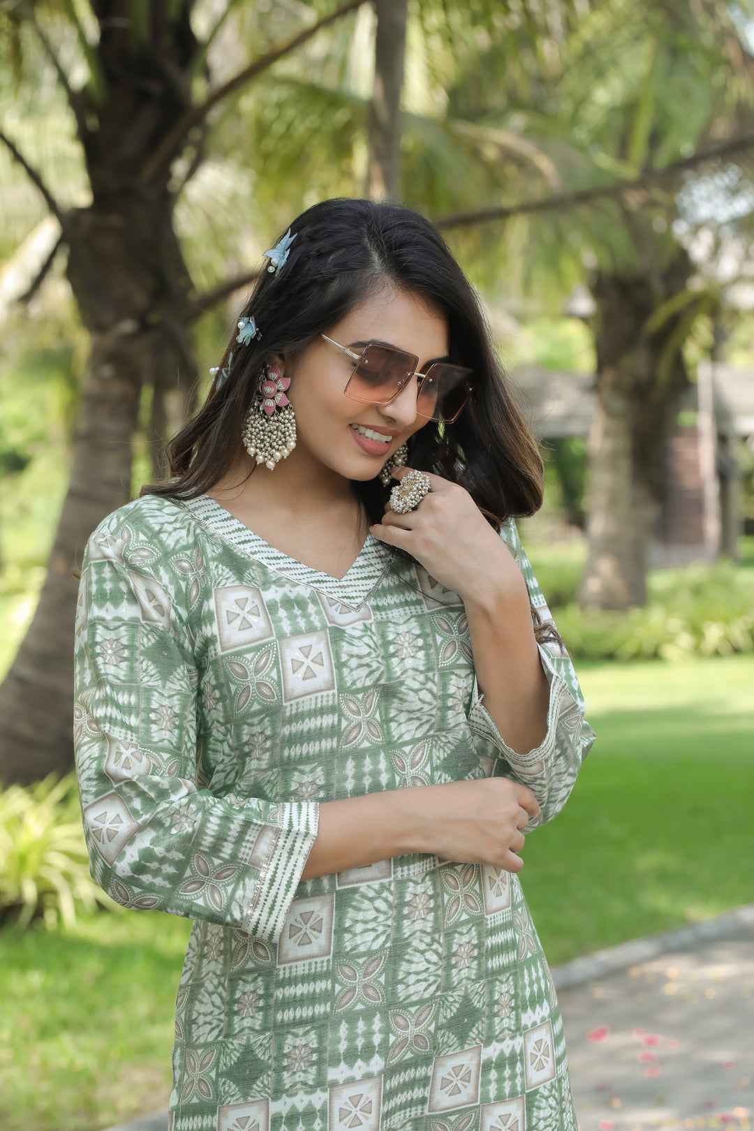Stylish cord set for women featuring a floral printed kurta with button details and flared.perfect for a trendy ethnic look.