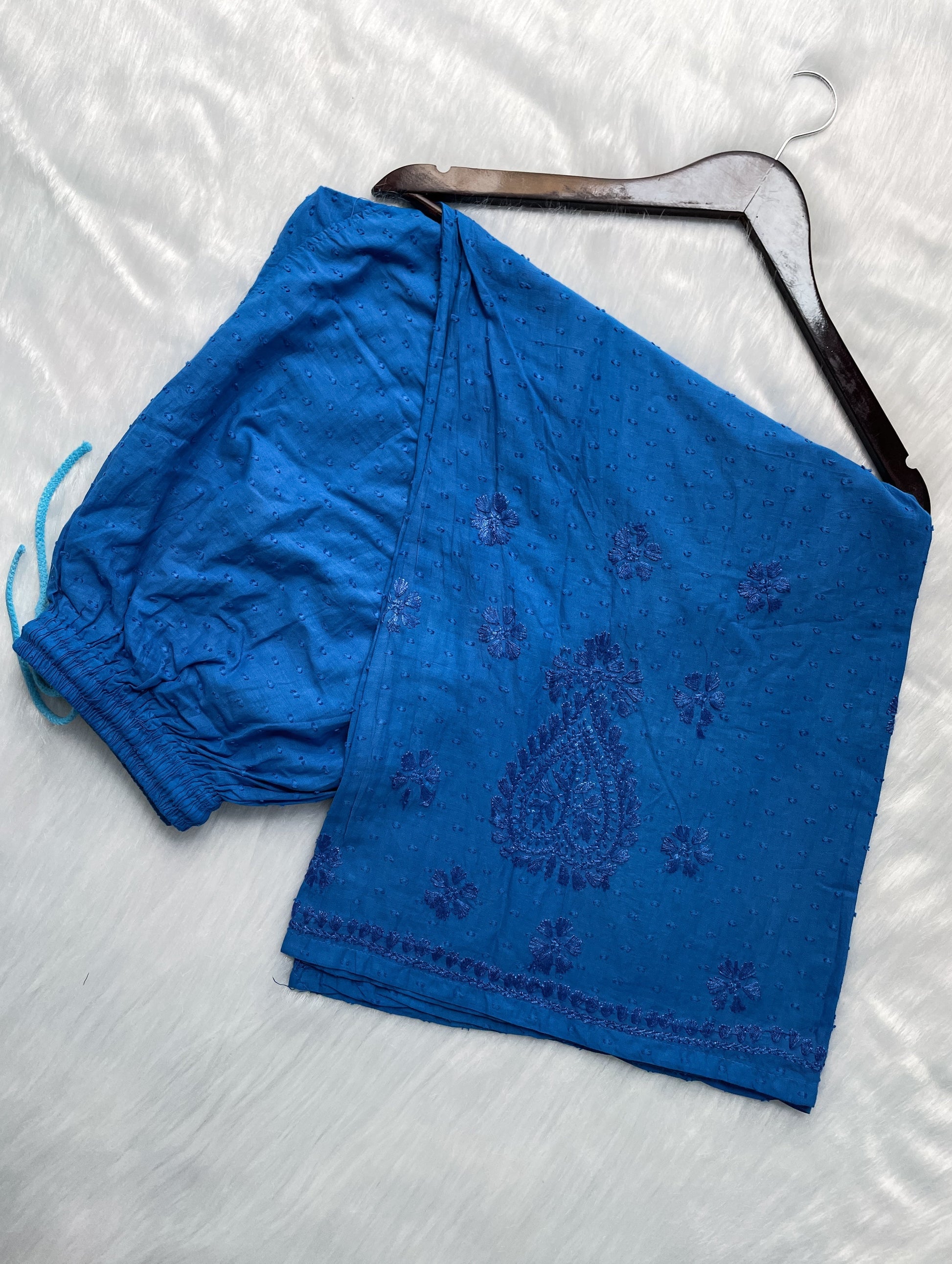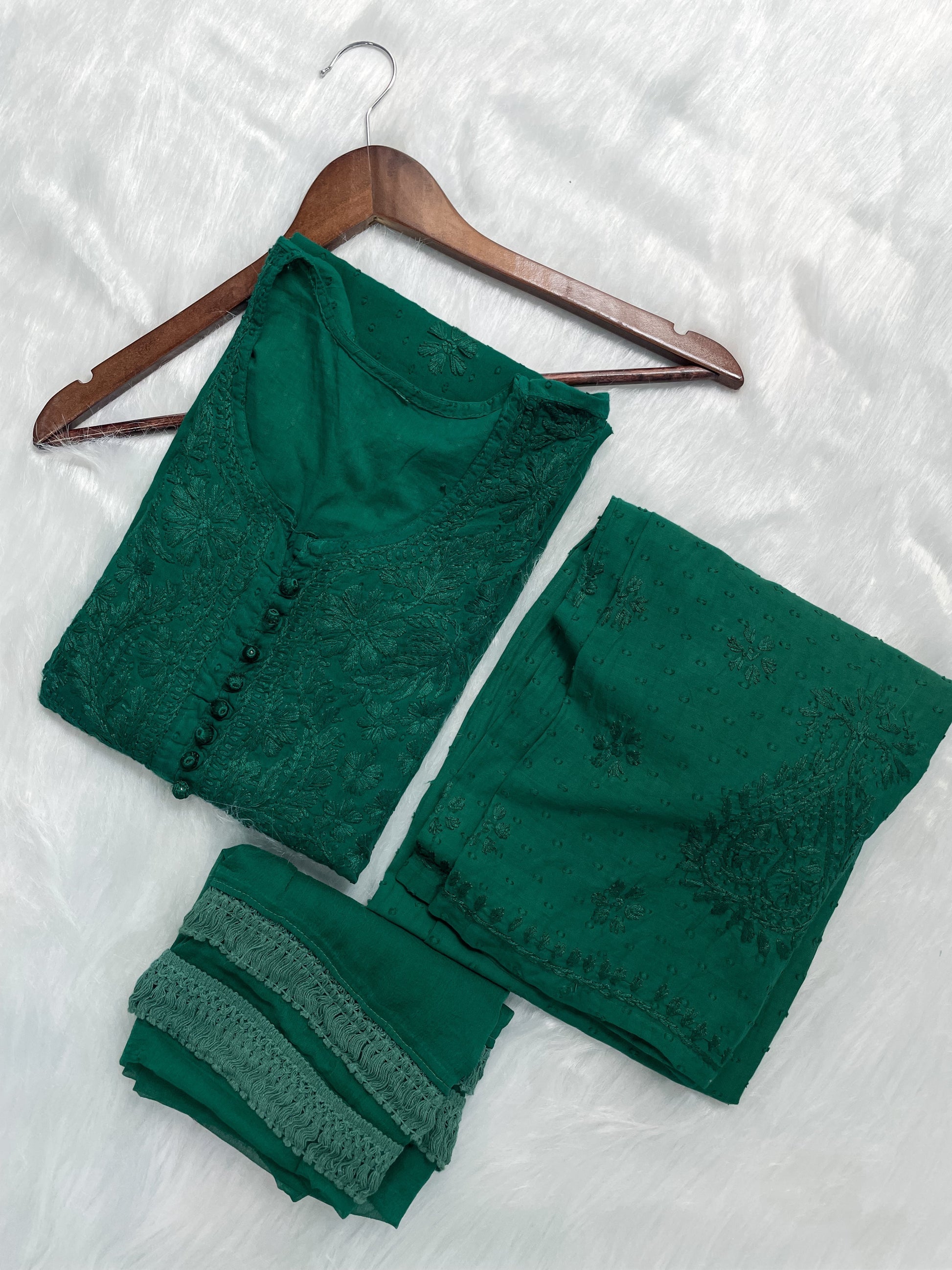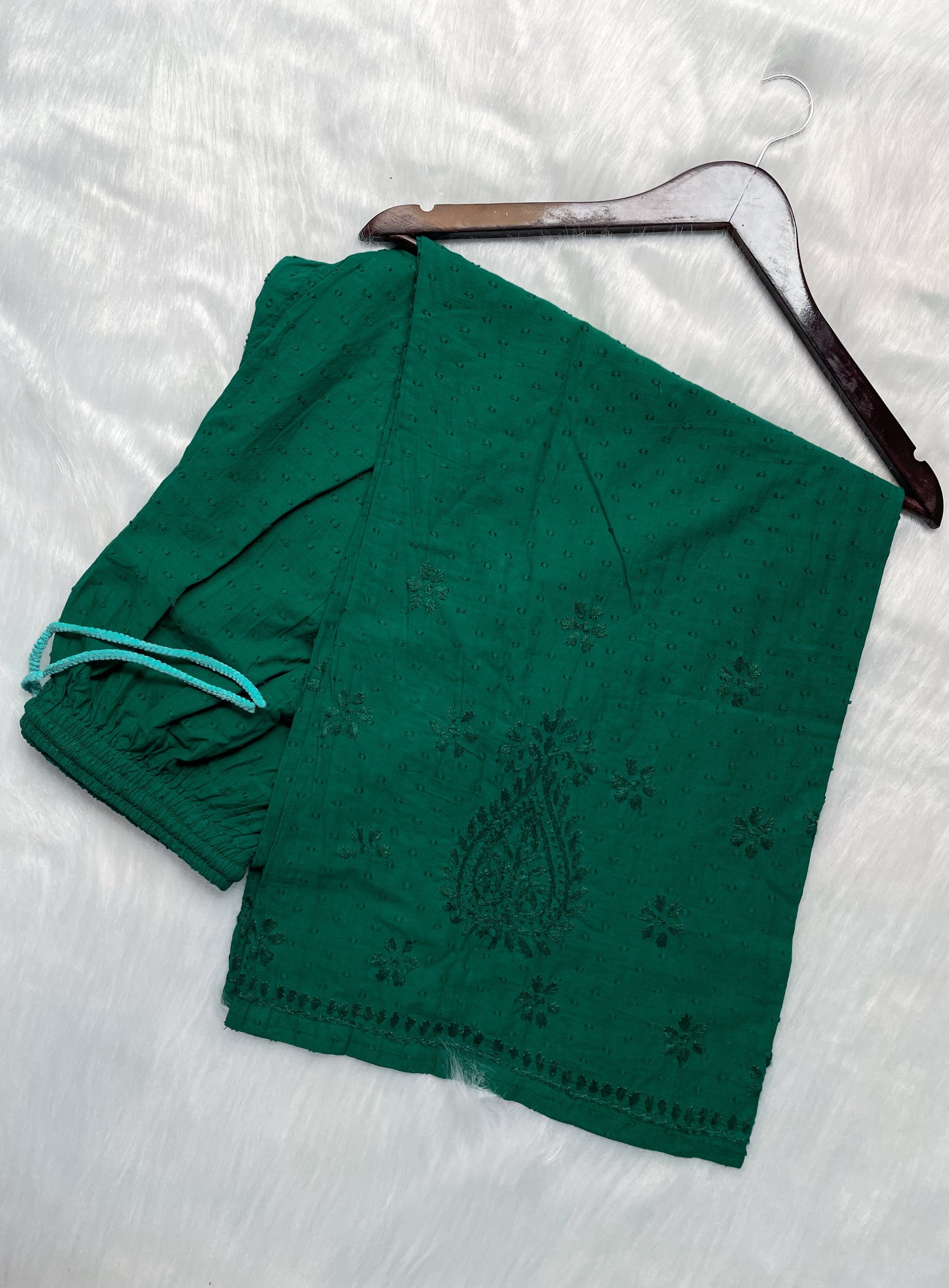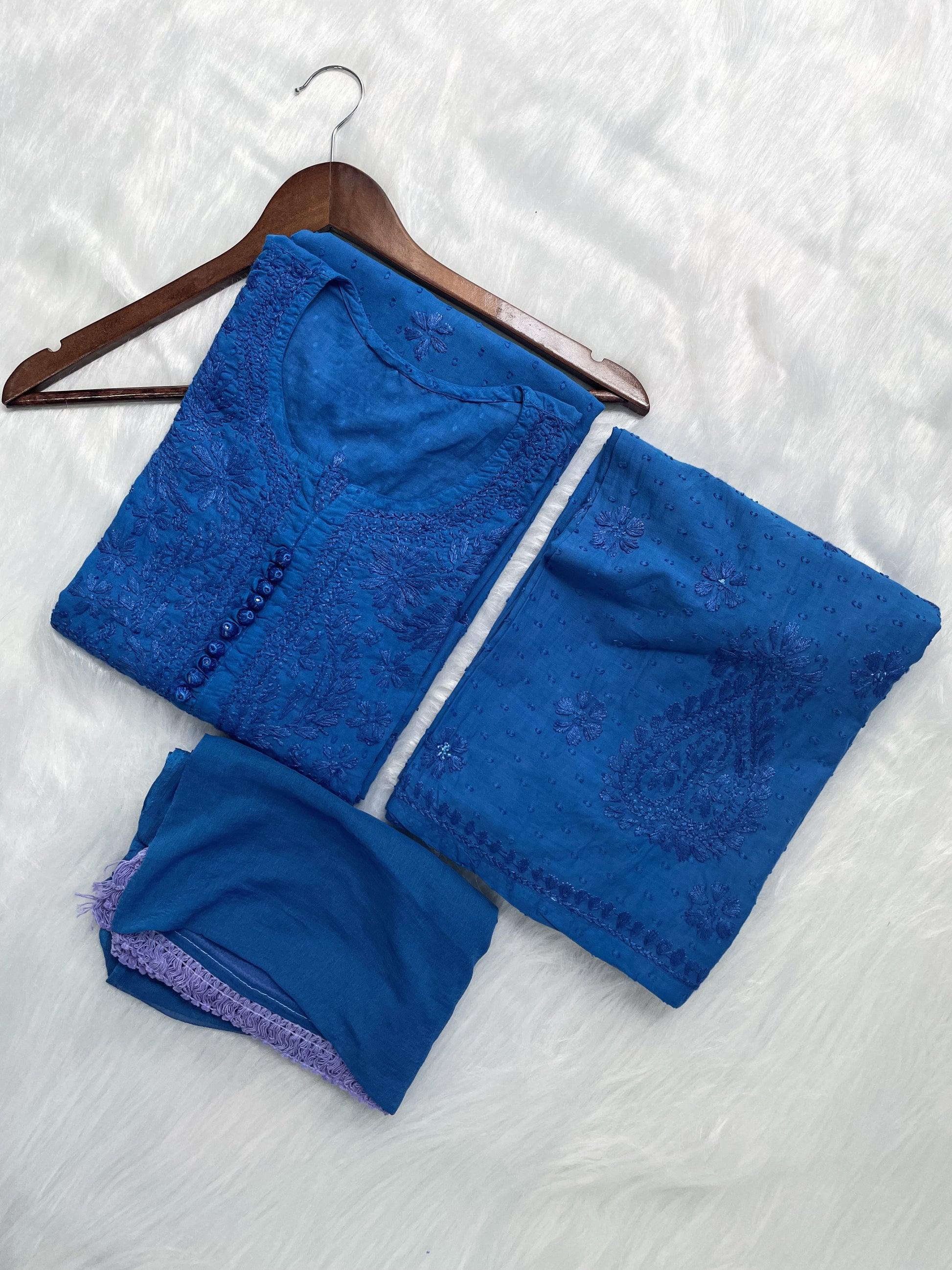 Handcrafted Dyed Lucknowi Chikankari Cotton Kurti, Palazzo & Dupatta Set