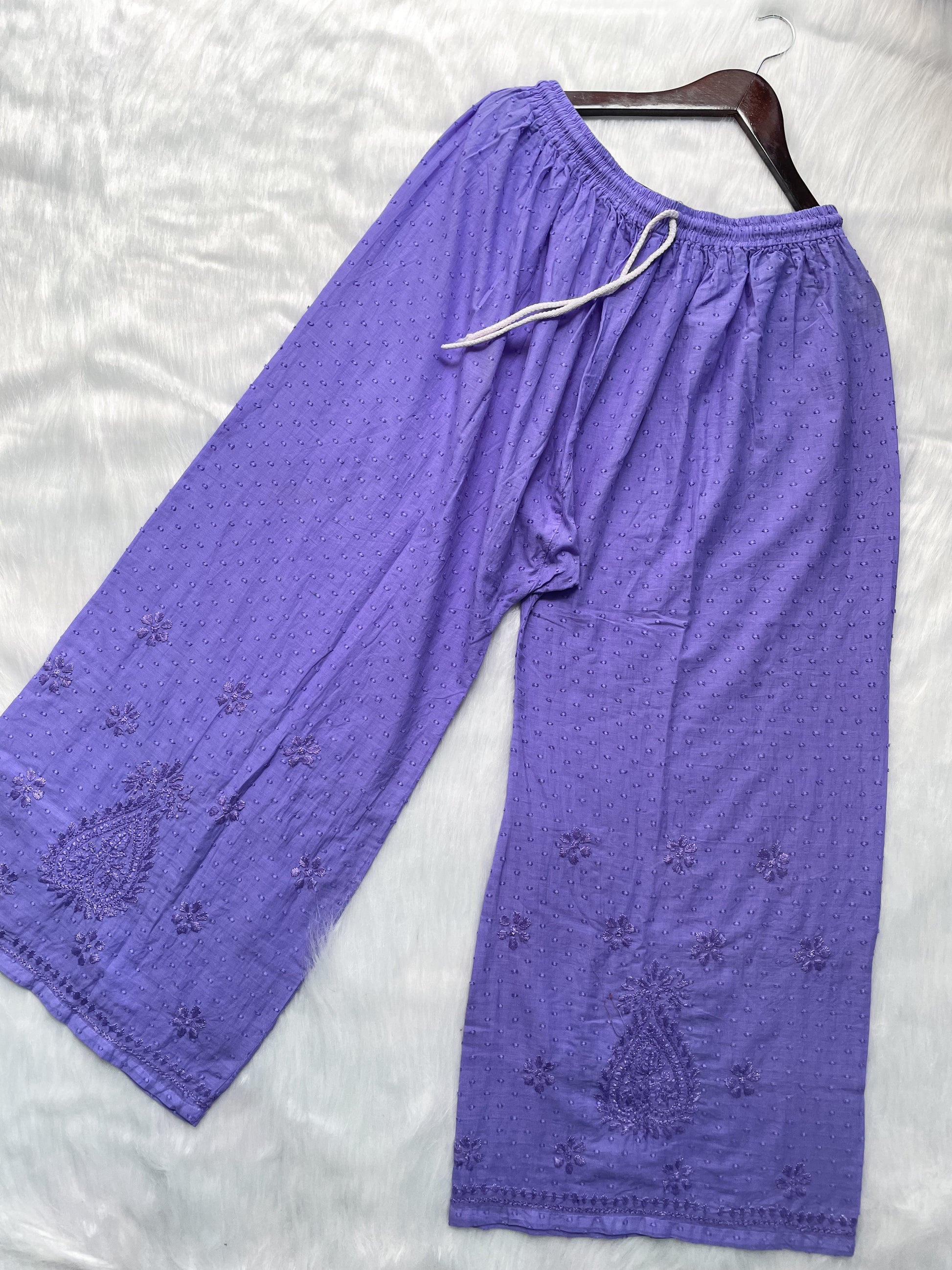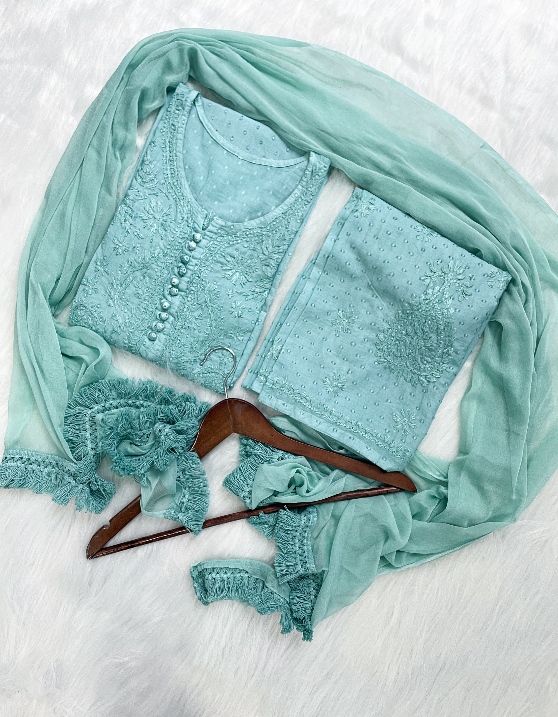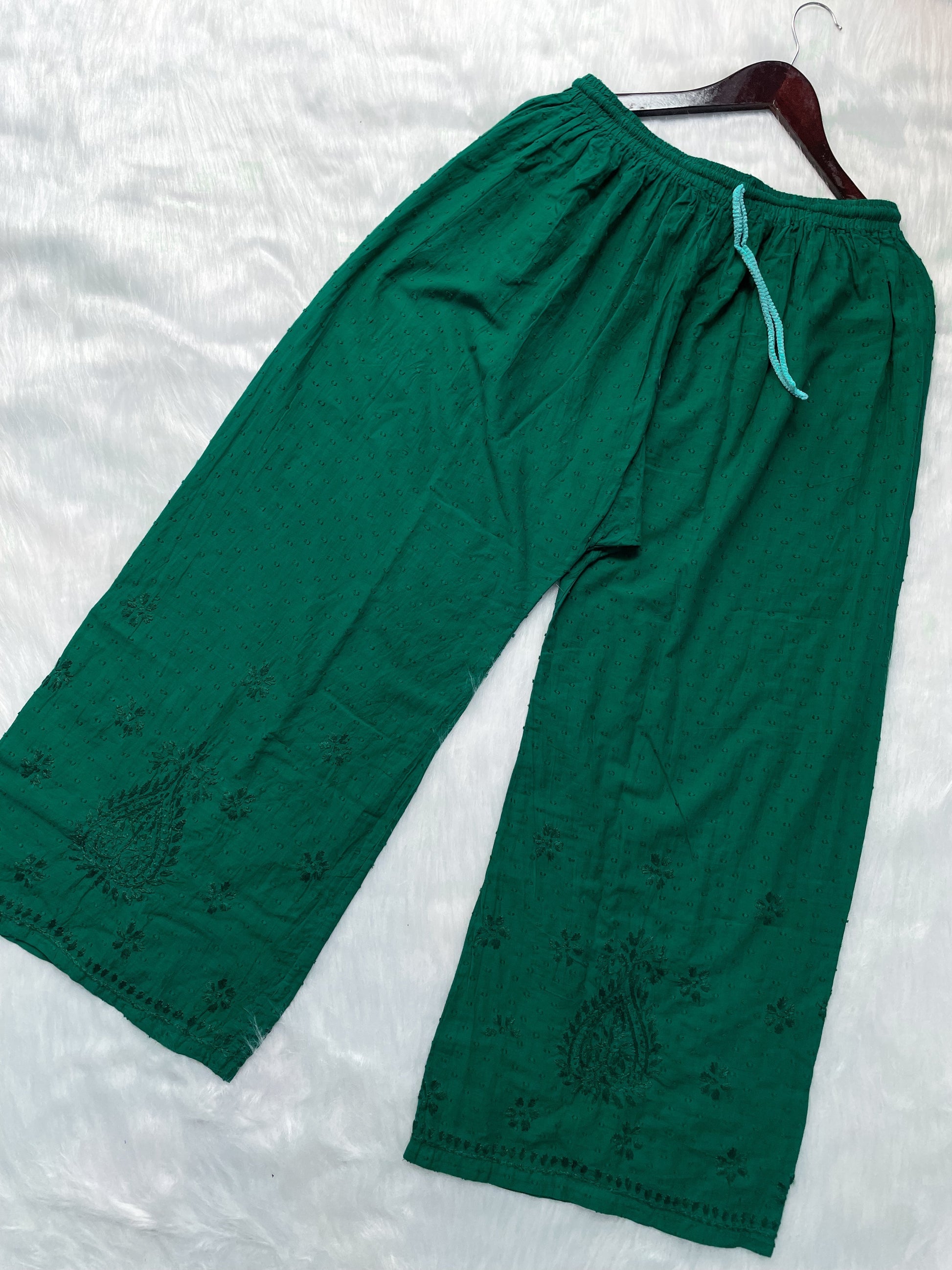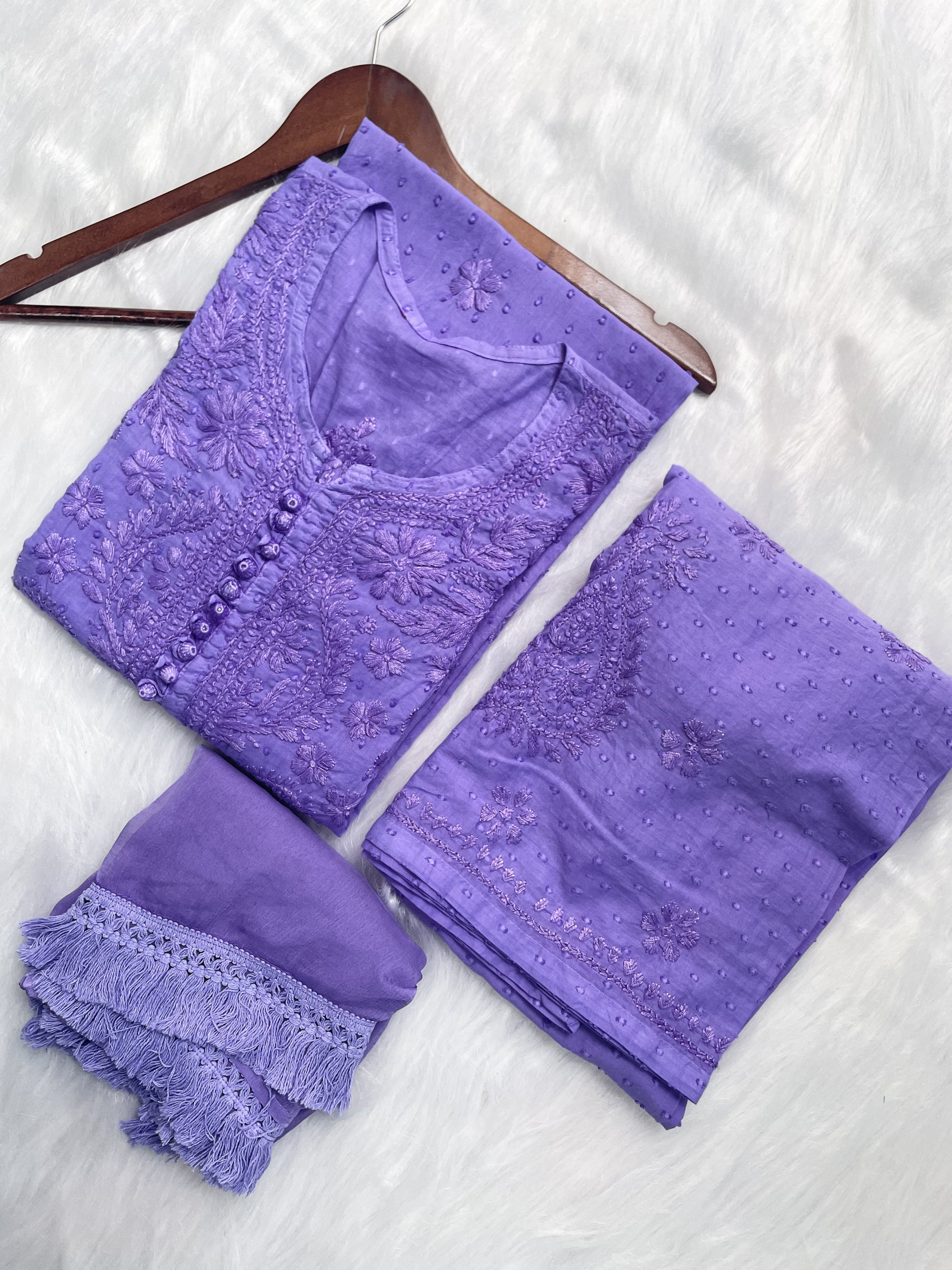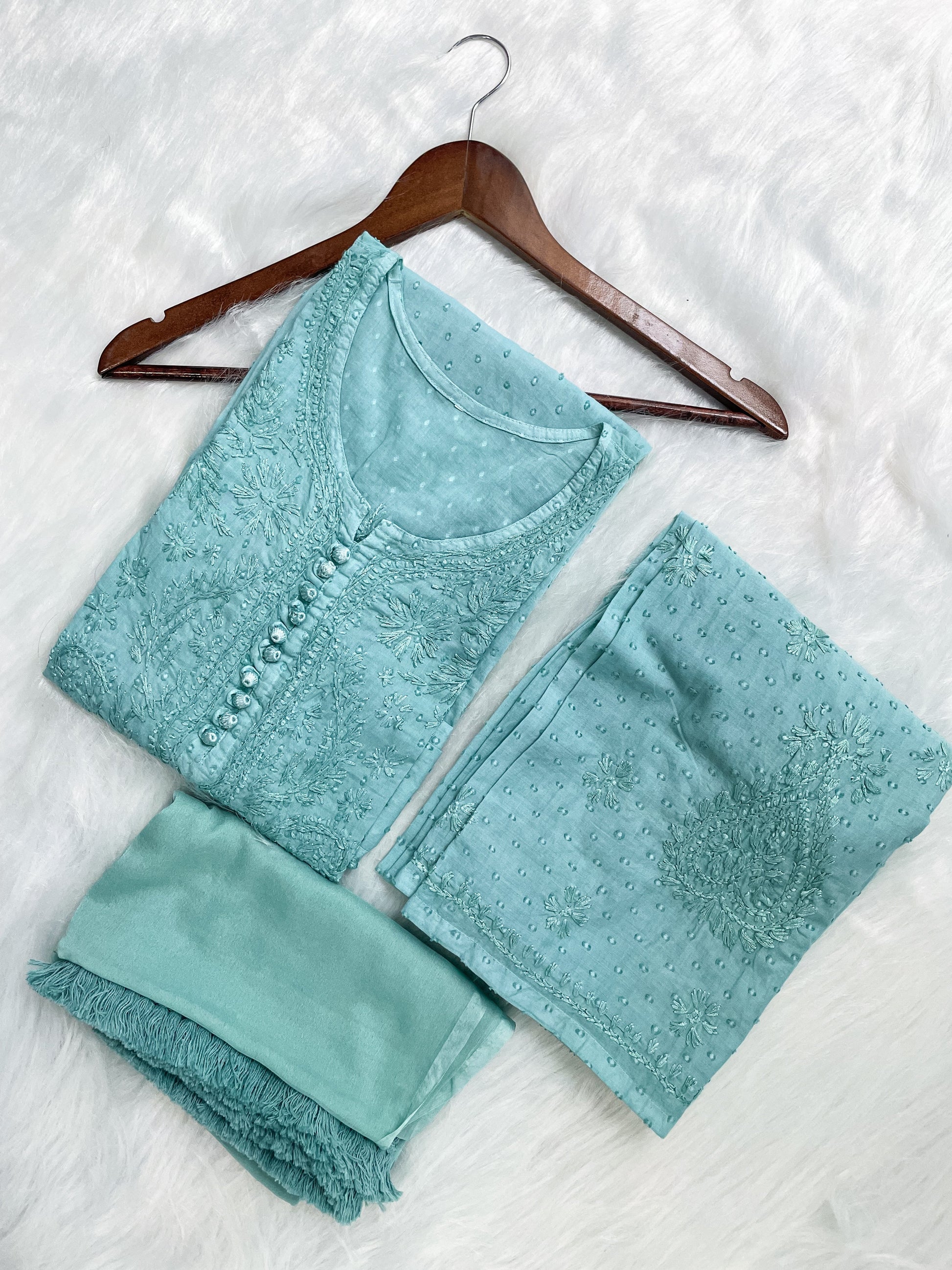 Handcrafted Dyed Lucknowi Chikankari Cotton Kurti, Palazzo & Dupatta Set